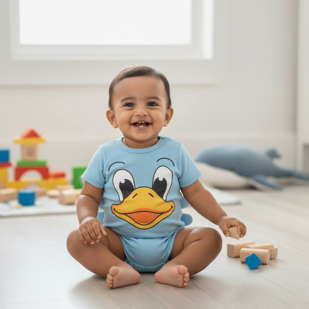 Make every day cheerful with the Cubtales Blue Duck Face Cotton Romper for baby boys. This playful romper features a vibrant blue color and a large, cute duck face print, complete with fun side wing accents for added character. Crafted from soft, breathable cotton, it keeps your little one cool and comfortable during every adventure, nap, or playtime. The short-sleeve design and convenient bottom snaps ensure effortless dressing and diaper changes. Tailored for baby boys aged 0 to 3 years, this romper is perfect for adding a touch of fun and comfort to your child's wardrobe.