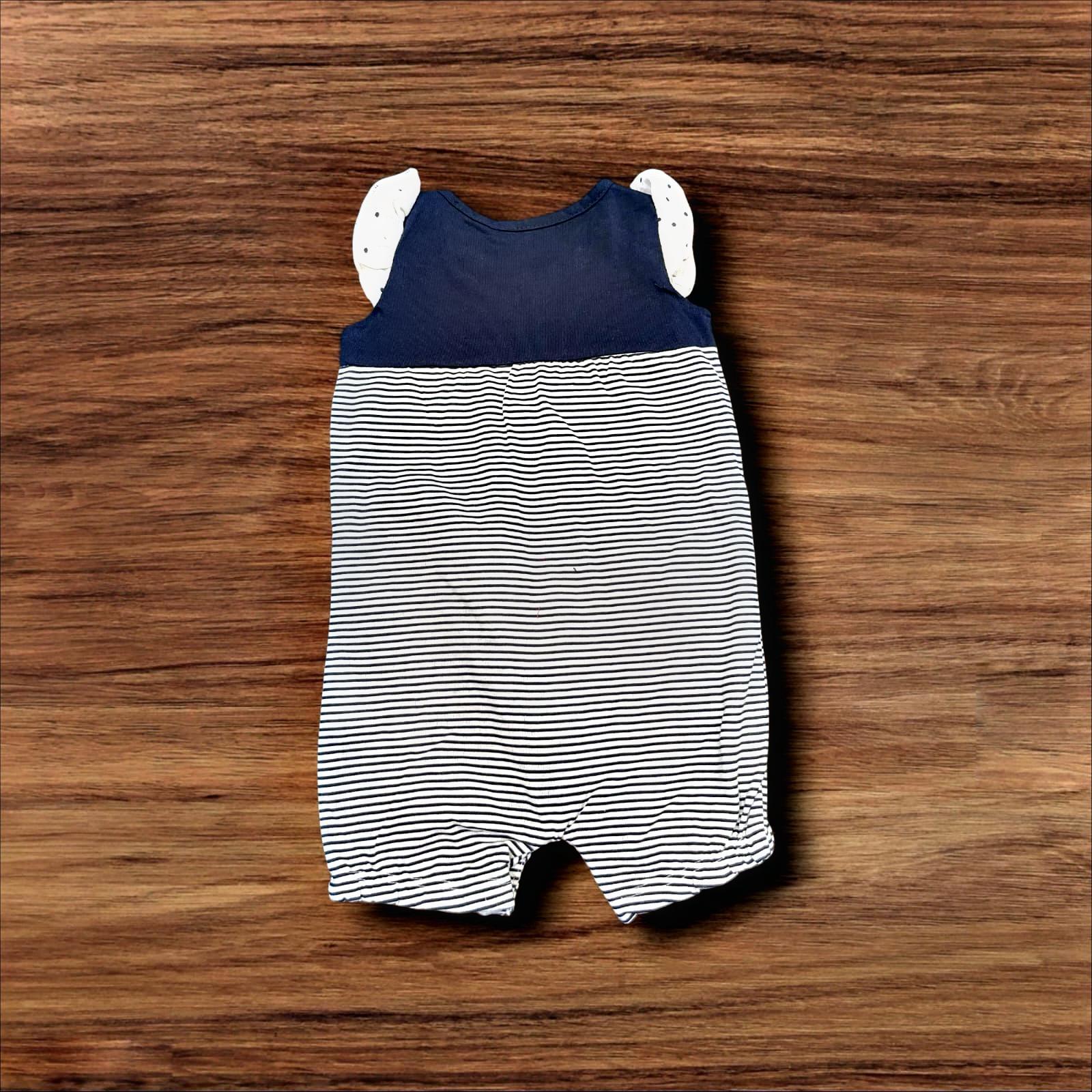 Dress your little one in enchanting style with our adorable Bunny & Floral Print Romper. This charming all-in-one outfit is designed to keep your baby girl comfortable and looking cute all day long. Made from a soft, breathable cotton blend, it's gentle on delicate skin and perfect for warmer weather. The romper features a stylish color-block design with a dark navy top and a classic navy and white stripe bottom. Two cute front pockets showcase a playful bunny face with ears and a sweet floral design, adding a touch of whimsical charm. The flutter sleeves with a polka dot pattern add an extra dose of cuteness, while the snap closures at the bottom ensure quick and easy diaper changes. It’s the perfect blend of style, comfort, and practicality for your little bundle of joy.