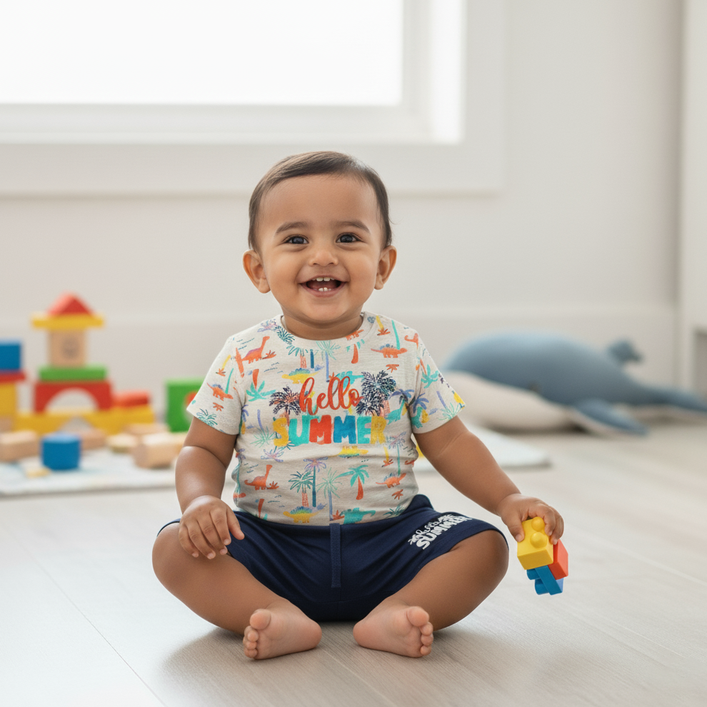 Brighten up your baby boy’s summer wardrobe with this cheerful Cubtales "Hello Summer" Dinosaur Print T-Shirt and Navy Shorts Set. The soft cream t-shirt is filled with playful dinosaur and palm tree graphics, complemented by a vibrant "Hello Summer" text for a sunny-season vibe. Paired with comfy navy blue shorts featuring a fun tropical print, this lightweight cotton set keeps your little one cool, stylish, and comfortable all day long. Perfect for playdates, outings, or just soaking up the sunshine, this set is specially designed for baby boys aged 0 to 3 years.